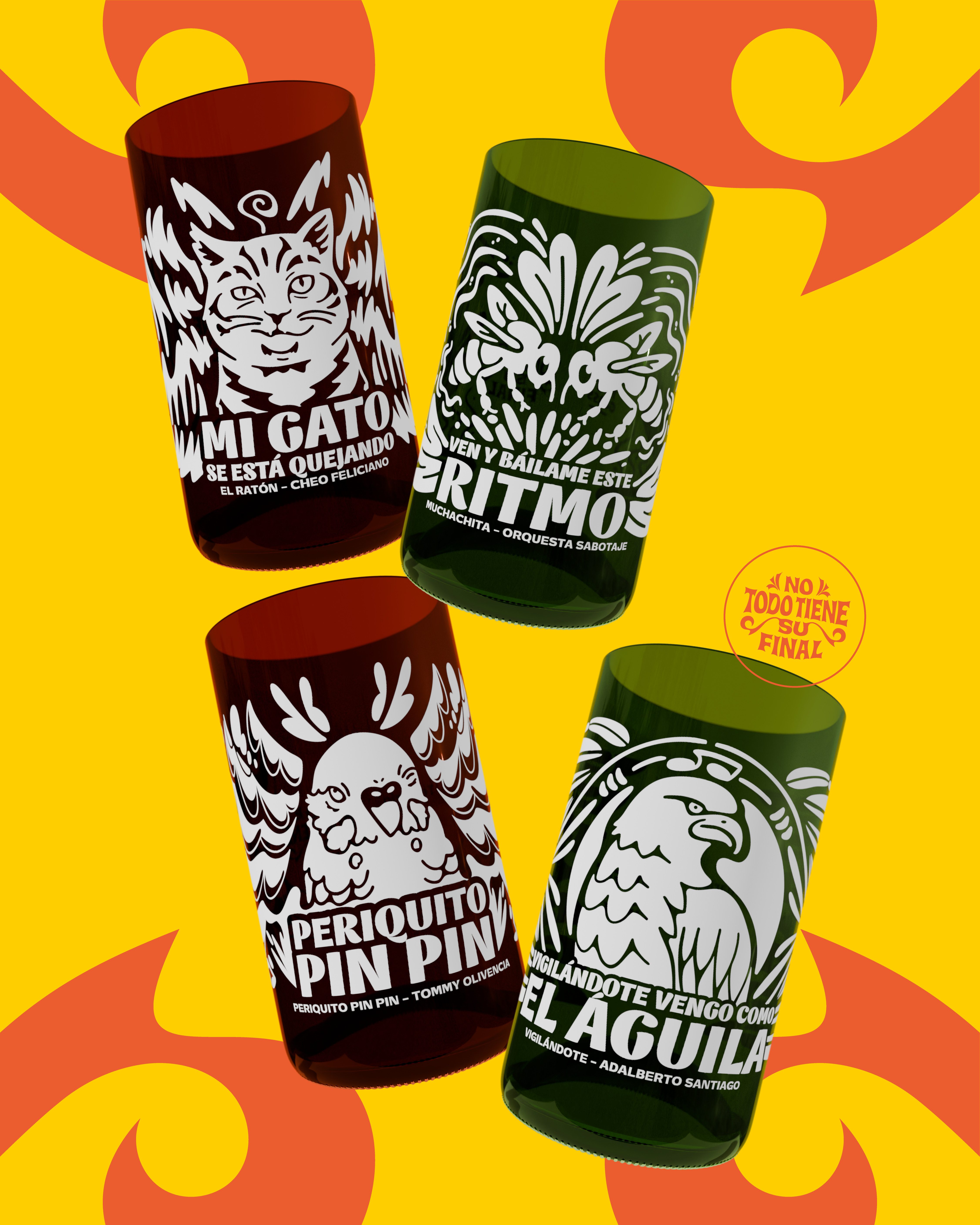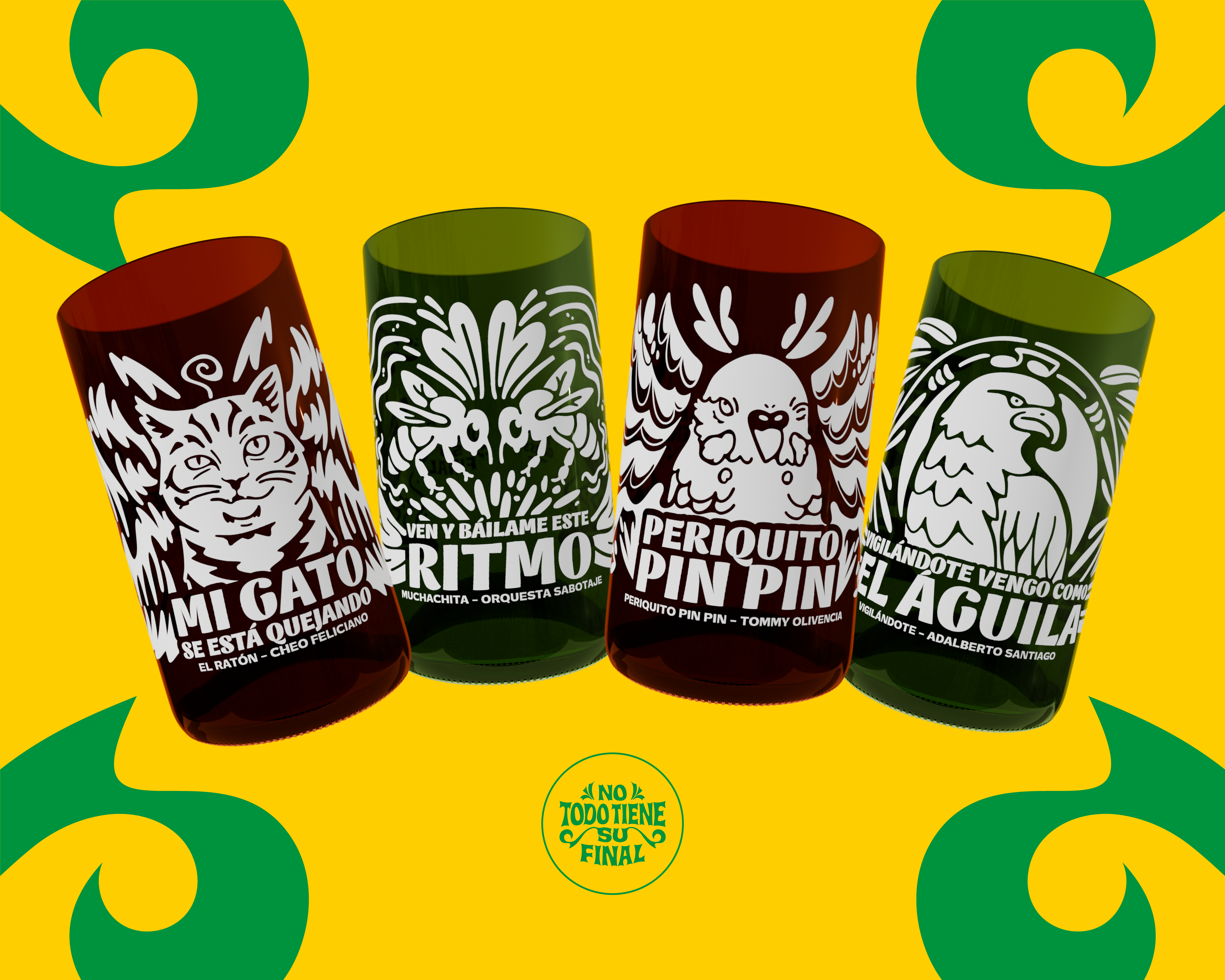 En esta edición especial celebramos la salsa y el cuidado del planeta a través de un colección exclusiva de vasos (x4 y x2) estampados en serigrafía, hechos 100% con botellas de vidrio recicladas e inspirados en algunos de los coritos salseros que suenan en cada esquina.